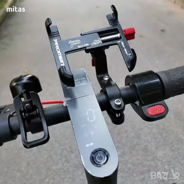 Стабилна и здрава универсална стойка за телефон, изработена изцяло от алуминиева сплав, предназначена за монтаж върху кормилото на велосипед, електрически велосипед или тротинетка. Отличава се с прецизна изработка, сигурен захват и възможност за пълно завъртане на 360°, което я прави идеален избор за използване на навигация, проследяване на маршрути и комуникация в движение.