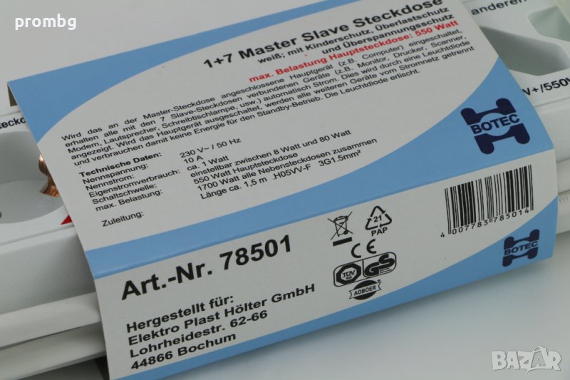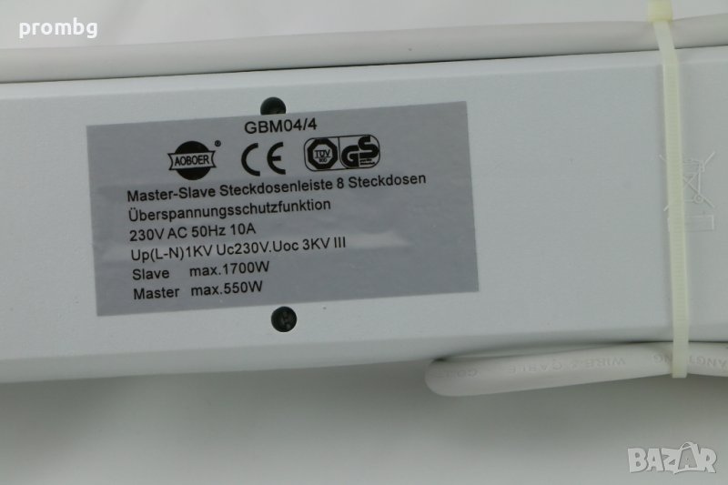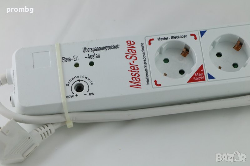 разклонител Master Slave 7+1, Германия. Технически данни 130 V / 16 A. Дължина 450 мм, ширина 70 мм, височина 50 мм. Дължина на кабела 1,5 м. Напречно сечение на кабела 1,5 mm². Входно напрежение 220 - 240 V AC, Мрежова честота 50/60 Hz. Изходно напрежение 230 V AC