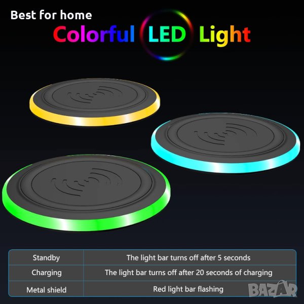 Леко и преносимо: дебелината на безжичното зарядно е около 0,39 инча. LED безжично зарядно може да се постави на маса или нощно шкафче и е леко и преносимо. Също така може лесно да се постави в чанта и раница, подходяща за дома, офиса или пътуване.