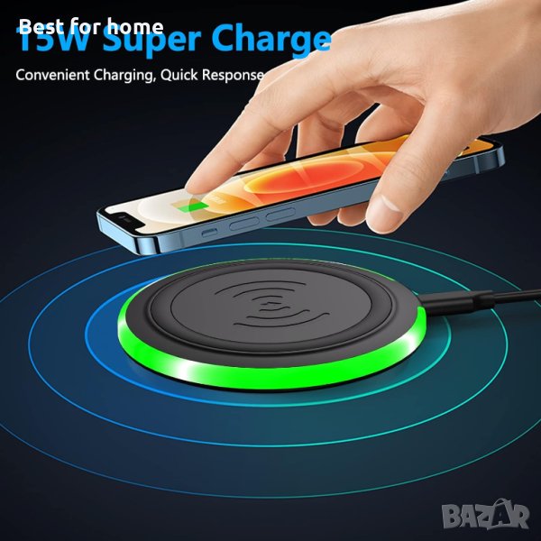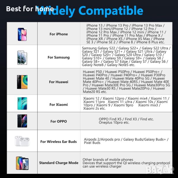 Четири съвместими режима: подложката за безжично зареждане поддържа четири различни режима на зареждане 5/7,5/10/15W. Режимът на зареждане е подходящ за всяко устройство, което поддържа QI, като iPhone 13/13 Pro/12/12 Pro/12 Pro Max/11/11 Pro/11 Pro Max/XS MAX/ XS/XR/X/8/8 плюс, Google Pixel 3/3XL/4XL, Samsung Galaxy S20/S20 plus/S20 Ultra/Note 1. 0/10. Plus/S10/S10 Plus/S10E/Note 9/S9/S8 и други Android системи.