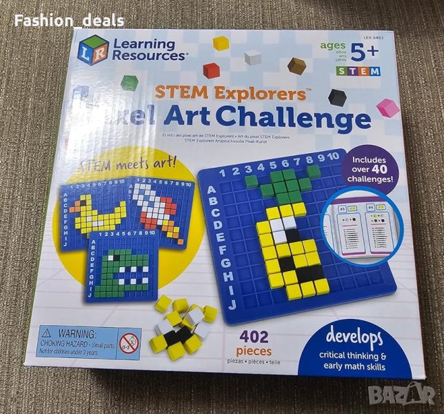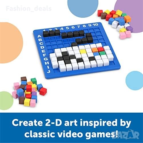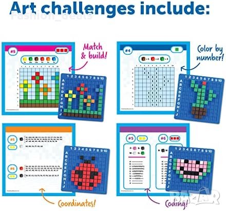 400 цветни пикселни кубчета с размер 1 см, дизайнерска основа 10 x 10 и ръководство за дейности.
