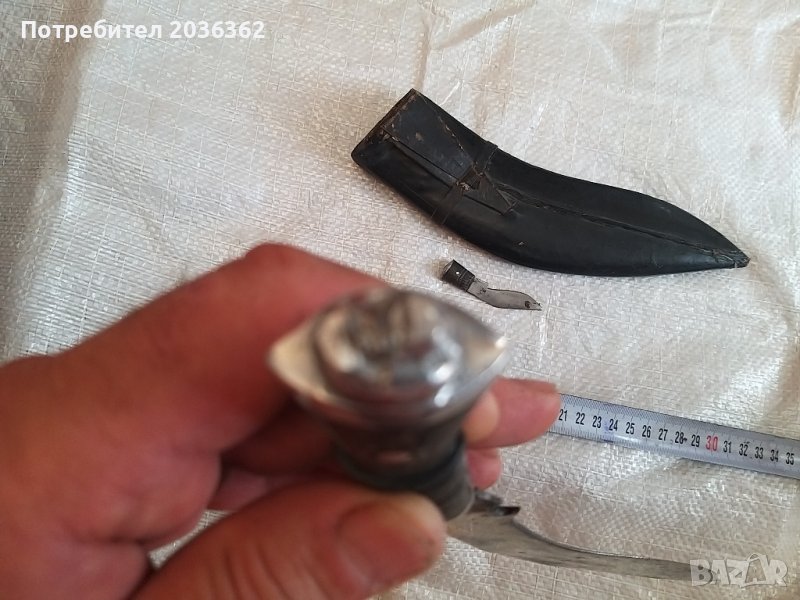 Доста прилично индийско кукри среден размер. В добро състояние. Никелирано острие с примитивна точкова гравировка, рогова дръжка с орнаменти от бял метал,дървена кания обвита с кожа. Нарушено покритие на острието с повърхностни поражения от корозия .Налични са и двете малки ножчета.