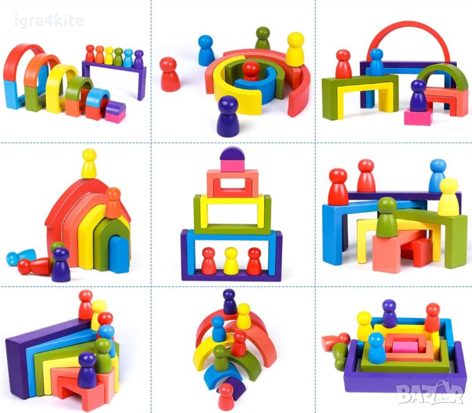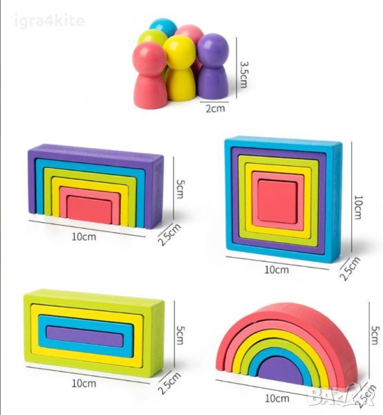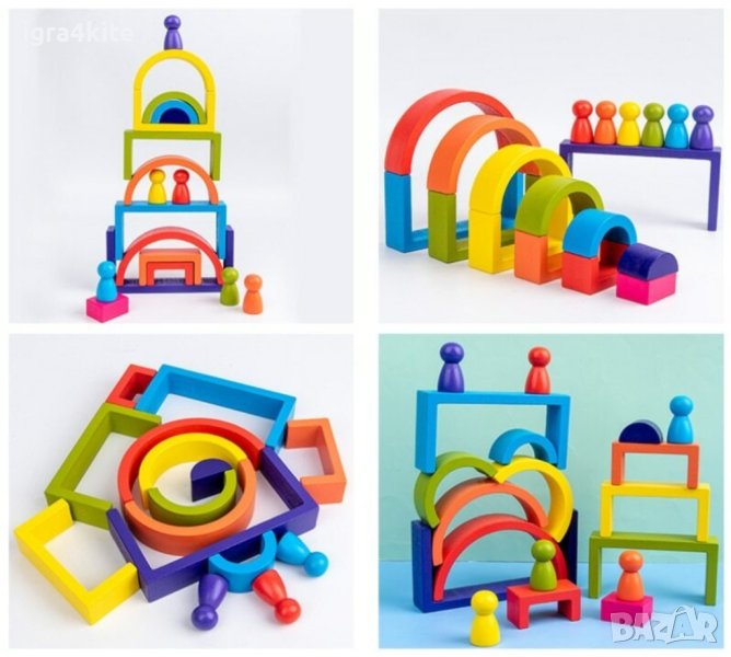 Тази универсална с "отворен край" Монтесори дървена играчка за подреждане на дъга съчетава 4 комплекта в едно.