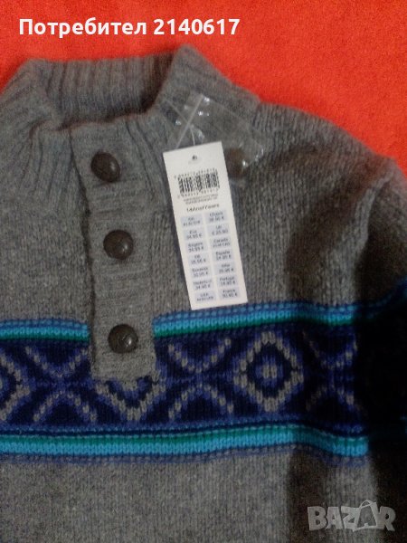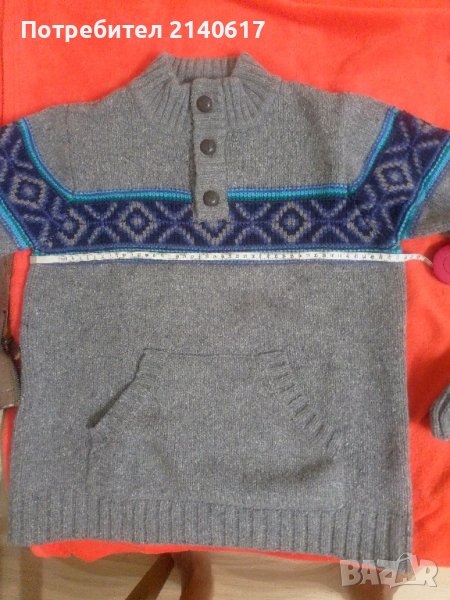 Нов пуловер за момче 14 г. на френската марка за деца OKAidi. Отлично съчетание на цвят, състав и качество. Цена в магазин 73лв. ПОД Мишници-49см; Дължина-63см; Ръкав-63см. С преглед и тест.