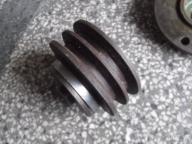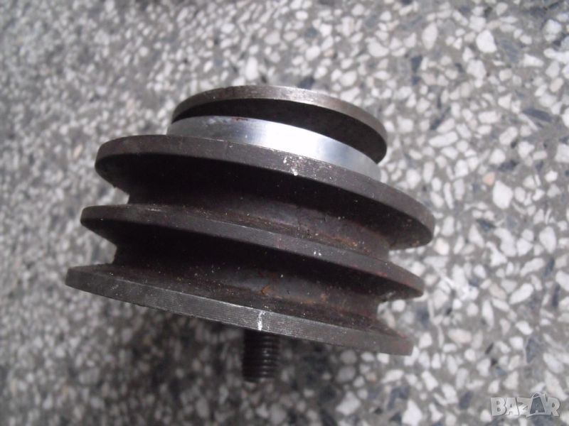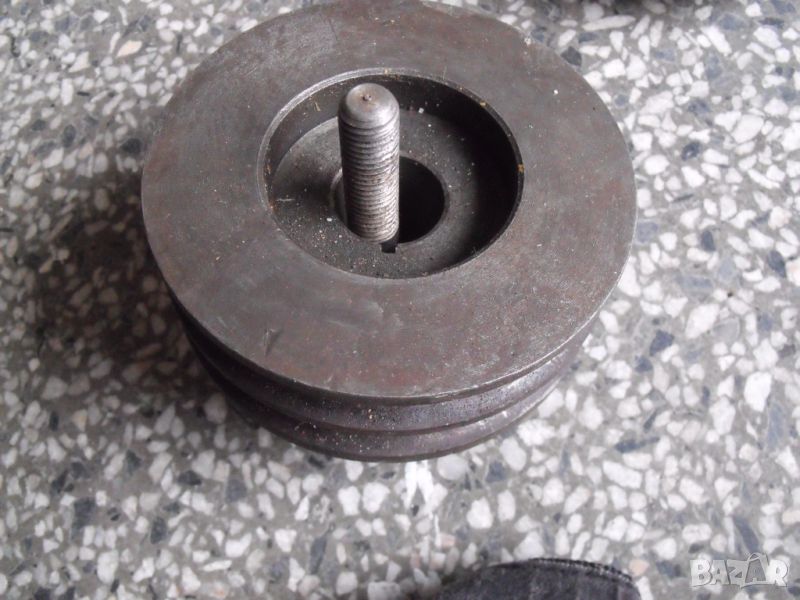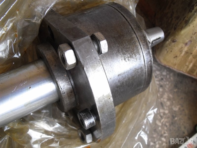 вал от промишлено оборудване, с фланцово закрепване, диаметър - 50 мм, дължина 55 см, завършва с конус от двата края, двойни лагерни тела са с оригиналната си грес, движат се свободно, имам и ремъчна шайба към вала.