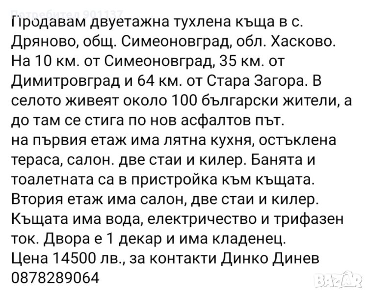 Продавам тухлена двуетажна къща в с. Дряново, общ. Симеоновград, обл. Хасково. Цена по договаряне!