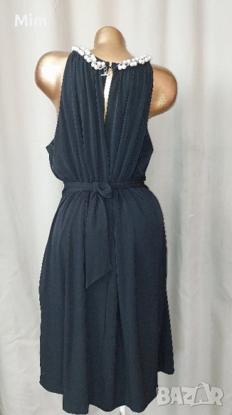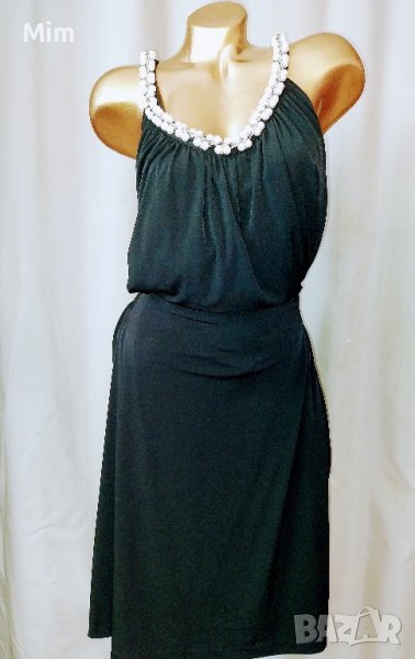 Черна свободна рокля с колан отпред може да се връзва според размера на тялото на деколтето е с богати бели перли със метален синджир закопчаването е отзад. Подмишници 70 до 80 см едностранно, дължина 110 см с подплата. Няма следи от употреба.