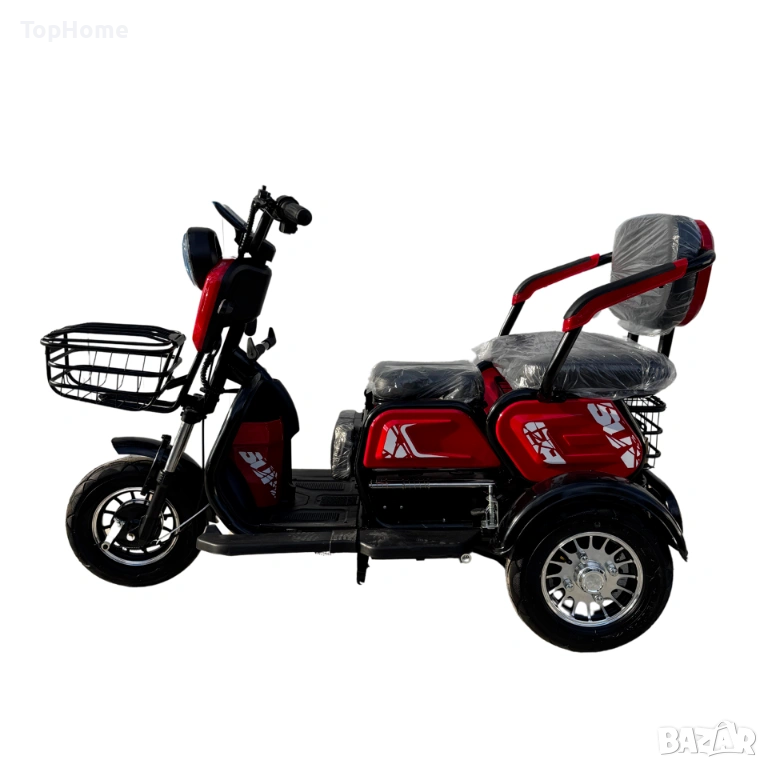 Уникална триместна триколка X1 - без аналог на пазара. Триколката е с дигитално табло, три нива на скоростта, стопове, мигачи и габарити, LED фар. Предна и задна ръчни спирачки. Крачна спирачка. Голям кош за багаж. Триколката е с вградена втора седалка за допълнителен пасажер, като самата седалка се движи във височина, което създава удобство за нисък или висок човек.