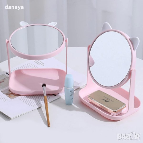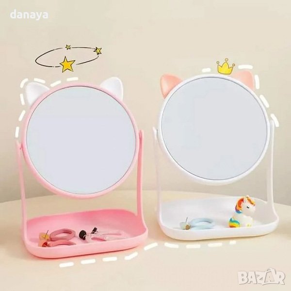 Козметично огледало на поставка, в която може да се сложи мобилен телефон, или други дребни аксесоари и козметика. Огледалото е кръгло и може да се регулира ъгъла, така че да ви е най-удобно. Чудесно е за сутрешният грим, или за вечерни козметични ритуали. Със закачлива декорация в горната си част – ушички. С компактни размер – лесно сглобяемо и разглобяемо, което позволява да го вземеш със себе си навсякъде.