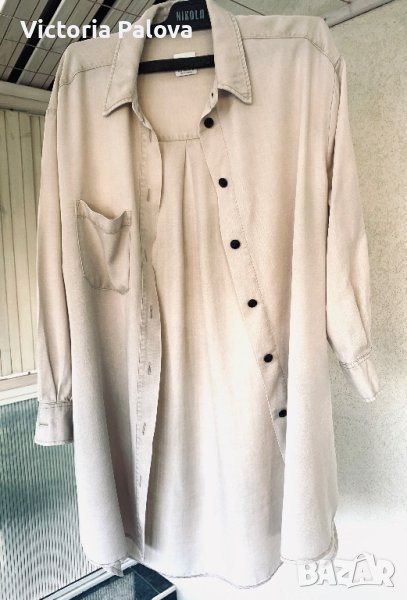 Модерна туника овърсайз неутрален цвят, тежка гладка много приятна материя, паднало рамо,ибъл долен край, цепки отстрани. Рамо - 56см, ГО - 68см, дължина отпред - 84см , отзад - 98см, ръкав - 55см.