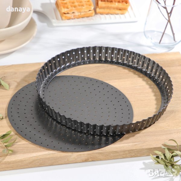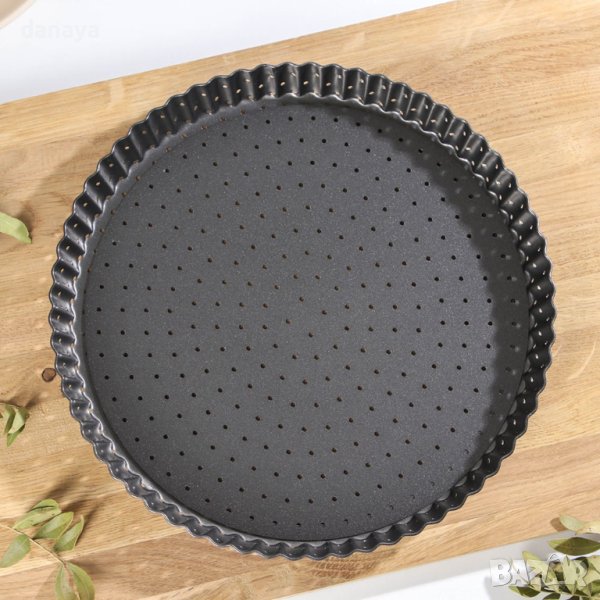 Кръгла перфорирана тава с падащо дъно подходяща за печива с хрупкава коричка, хляб, хрупкави пици, пържени картофи и др. Перфорираната тава за печене ще ви позволи да направите най-вкусните десерти, тарт, пици, питки, пайове. Перфорираната текстура на формата осигурява приготвянето на твърдо и хрупкаво тесто, идеално за солени или сладки пайове и тарти. Долната част на тавичката е отделяща се, което позволява лесното изваждане на печивото от формата. Формата е перфорирана, което води до по-бързо приготвяне на десерти, питки, тарти, тестени изделия и резултатите ще бъдат грандиозни.