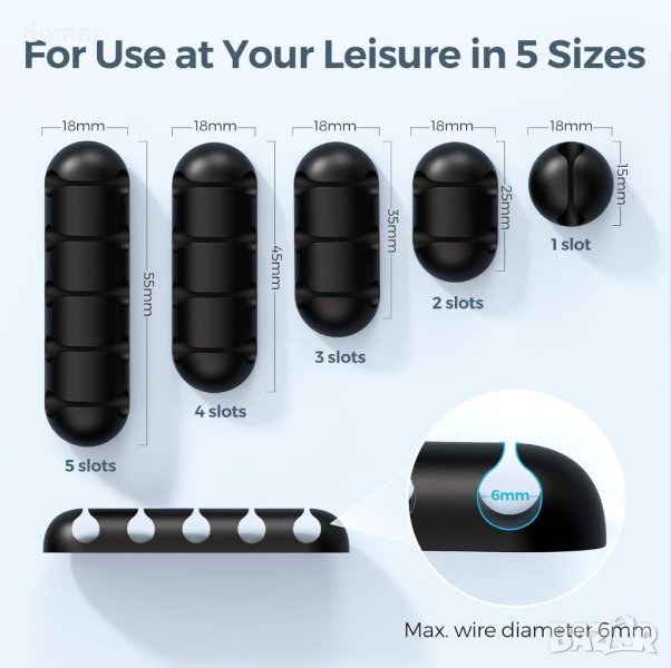 комплект включва пет държача за кабели, всеки с различен брой слота, вариращи
