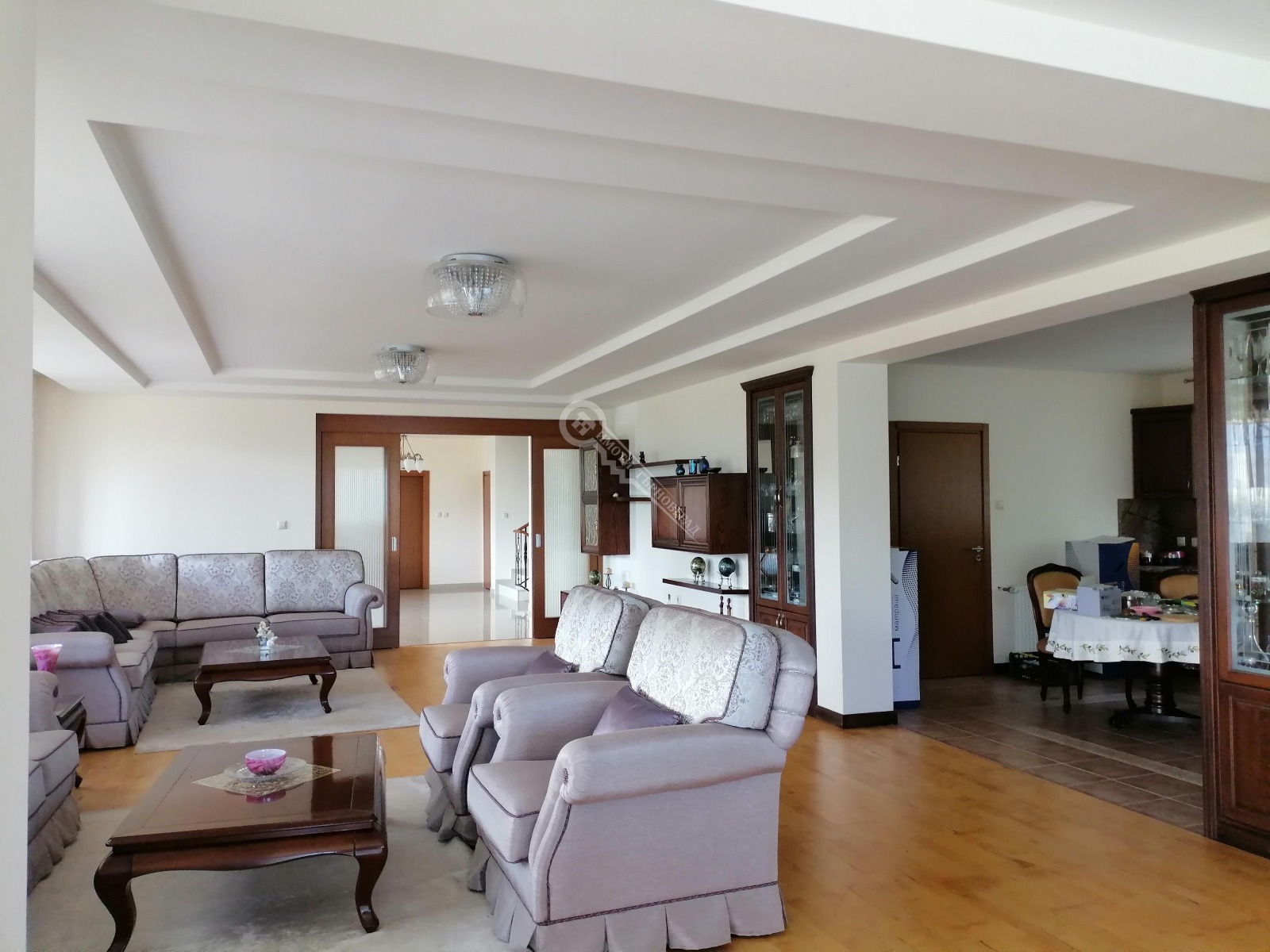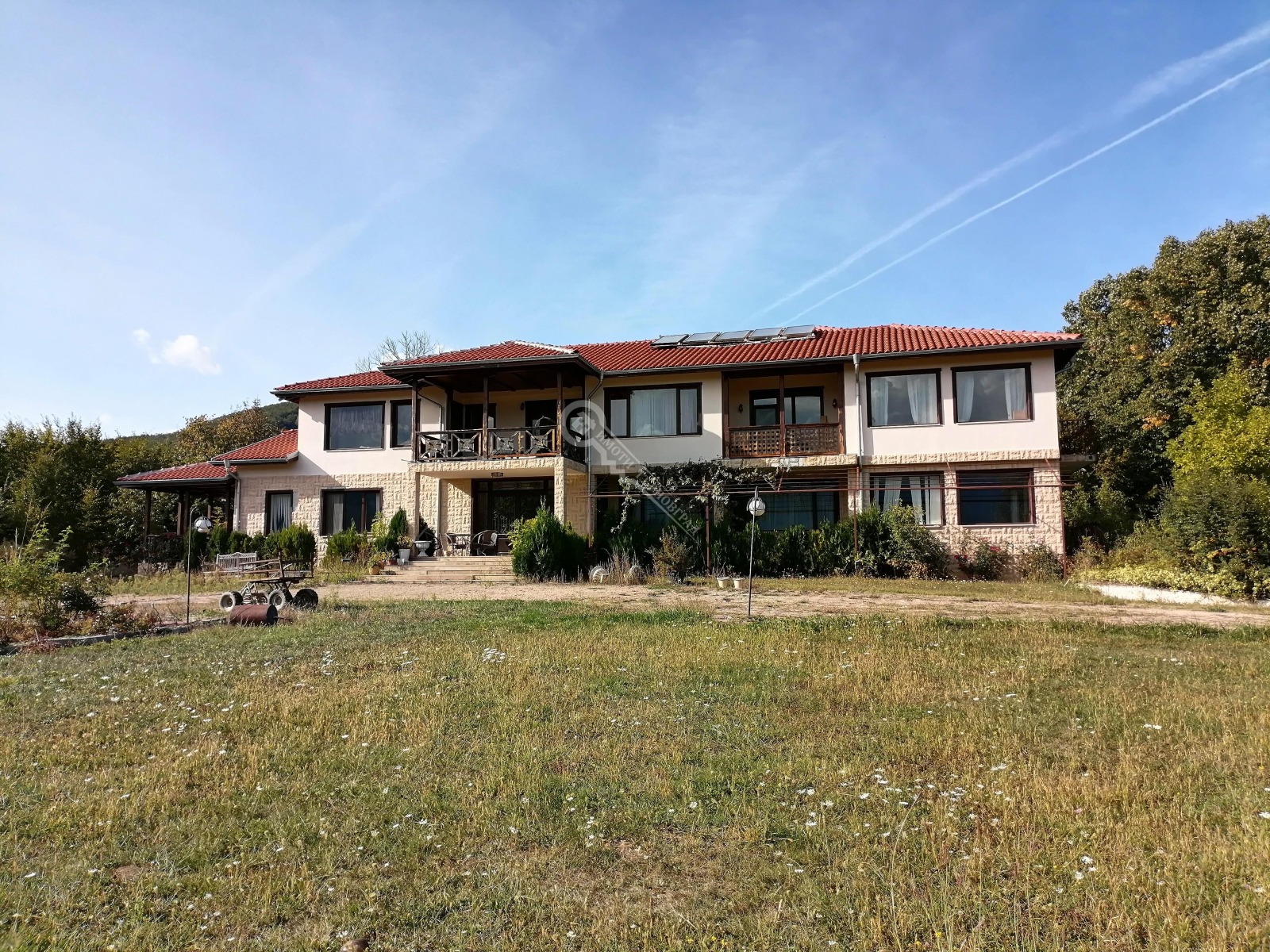 Основен етаж - просторно входно антре, голяма дневна, трапезария, островен бар, кухня, сервизно помещение, гараж за две коли, котелно, самостоятелен апартамент с две спални, мокро помещение и санитарен възел. Достъпът до останалите етажи е посредством вътрешно стълбище или асансьор. Втори етаж - два апартамента, всеки със собствен санитарен възел и гардеробна, три самостоятелни спални, всяка със самостоятелен санитарен възел и гардеробна, голяма панорамна тераса и три складови помещения. Сутеренен етаж - коридор, апартамент за гости, фитнес, работно помещение за СПА центъра, машинно помещение за асансьора и СПА. СПА центъра включва - басейн за водна гимнастика, парна баня, сауна, душ кабина и санитарен възел. Дворното място е с квадратура 5000 кв.м, към него има прилежаща второстепенна къща. Тя се състои от просторна механа с камина и кухненски бокс, санитарен възел, мазе и две самостоятелни спални, всяка със собствен санитарен възел. Имотът се предлага с наличното обзавеждане от поръчкови италиански мебели, както и с наличното оборудване. Има възможност за закупуване на съседни имоти. Оферта : 15793
