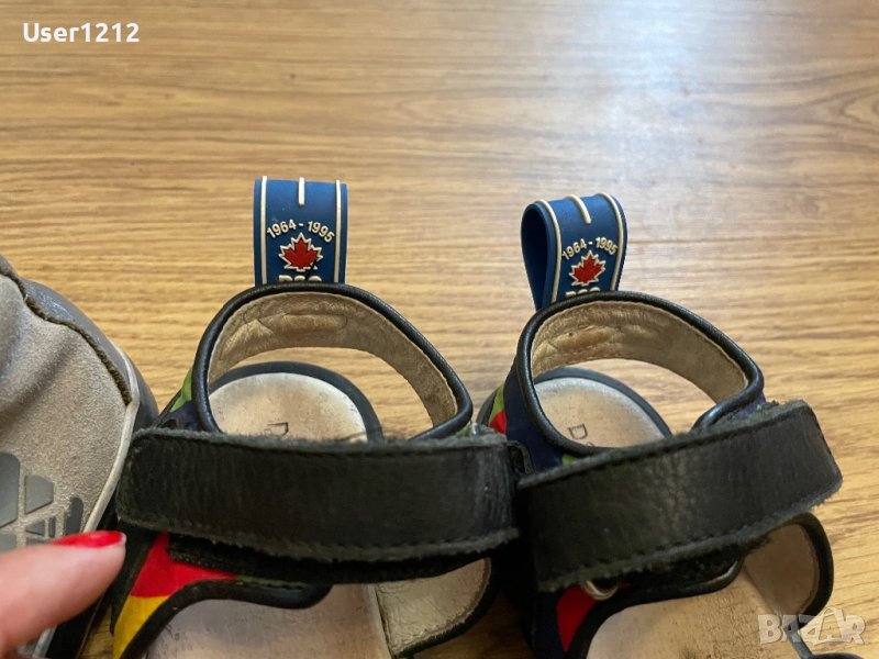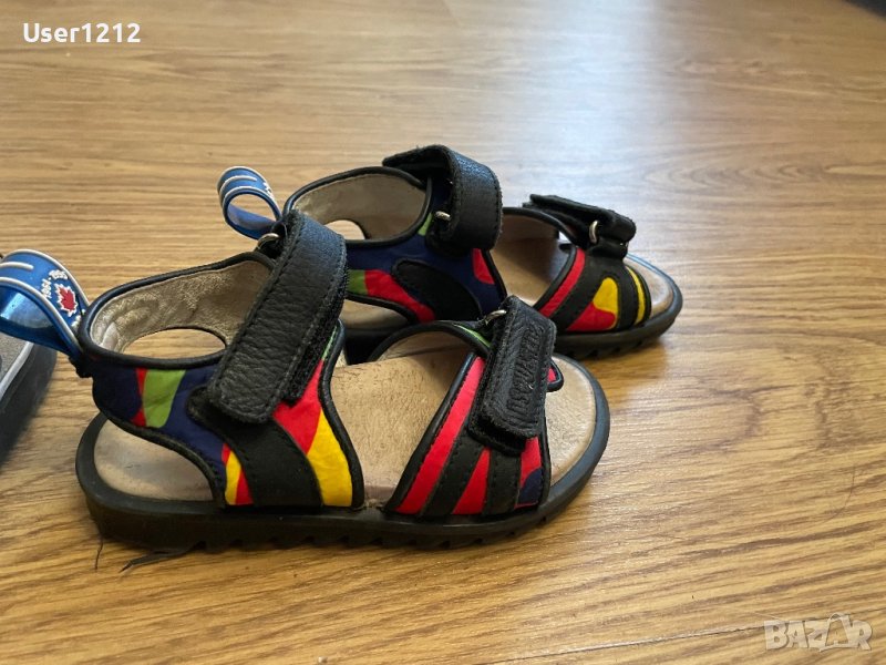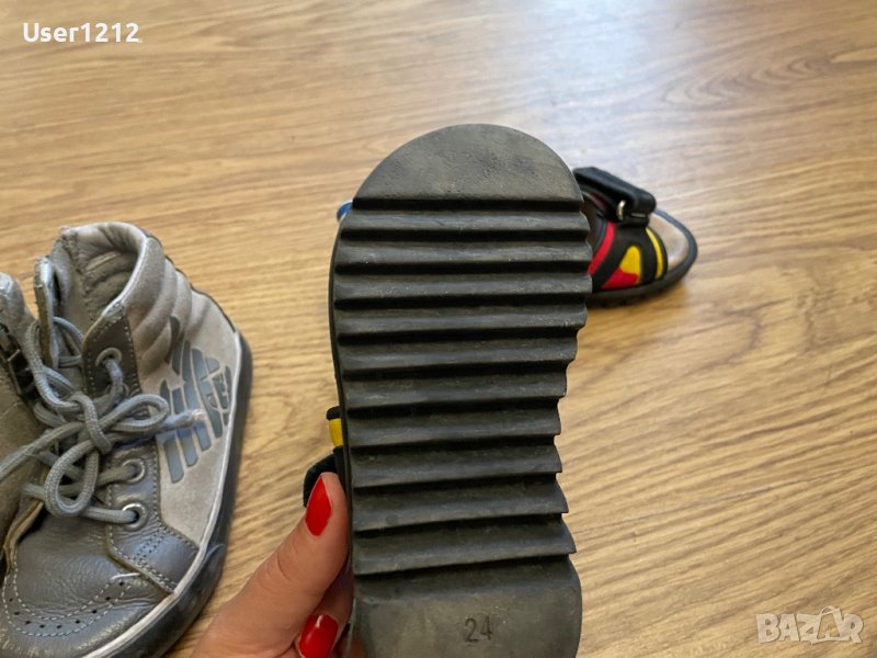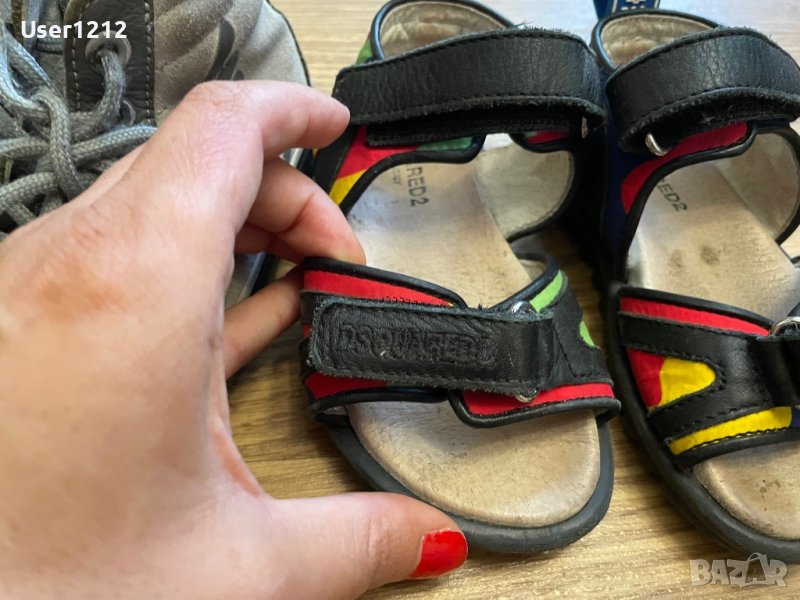 Детски сандали на Дискуаред , оригинални . Размерът е 24 , носени са , с нормални следи от употреба . Ботите са на Армани , 25 номер . И двете са естествена кожа . Ботите са с леки забележки - леко ожулено отпред . Цената е за брой