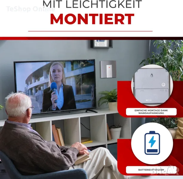 Работи с батерии: Безжичният звънец работи с батерии и следователно може да се поставя и транспортира гъвкаво.