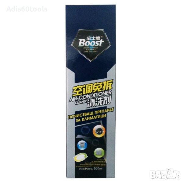Професионален продукт за почистване на хладилници, климатични и автоклиматични топлообменници. Спреят BOOST устранява всички прашни, маслени и бактериални замърсявания с помощта на силна почистваща формула. Продуктът се разпръсква под формата на пяна, като удължителят му позволява достигането до труднодостъпни места. При самото отмиване, продуктът преминава и през кондензната тава и маркучи, като така почиства и тях.