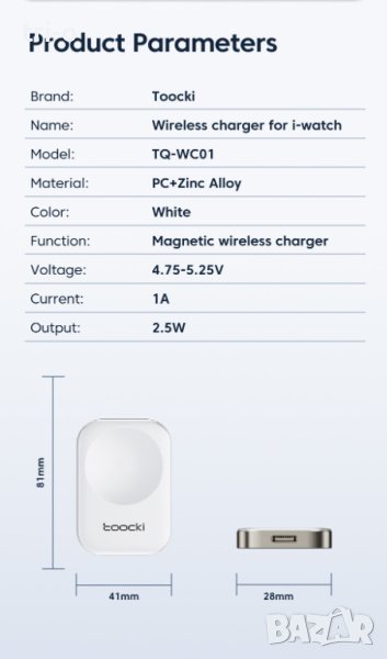 Магнитно зарядно устройство за часовник, 2,5 W безжично зарядно устройство ще зареди напълно I-watch за 2,5 часа, което прави зареждането по-лесно. Зарядното има вграден силен магнитен адсорбционен модул, който се зарежда с едно докосване.