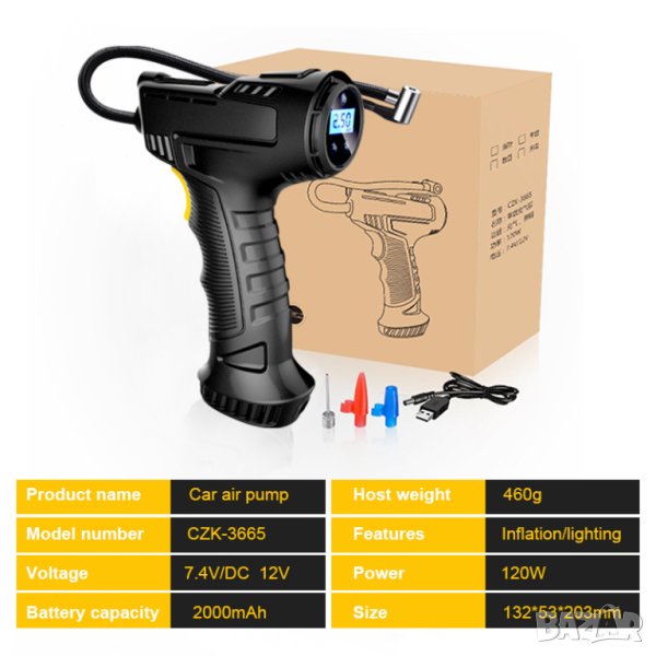 Този компресор е оборудван с вградена акумулаторна батерия, зареждаща се с USB кабел, включен в комплекта. Благодарение на мощната батерия може да доставя до 20 литра въздух в минута. Освен това има удобна дръжка, която улеснява помпането на колелата и гъвкав маркуч с допълнителни накрайници. 3-те накрайника са сменяеми, което улеснява използването на уреда.