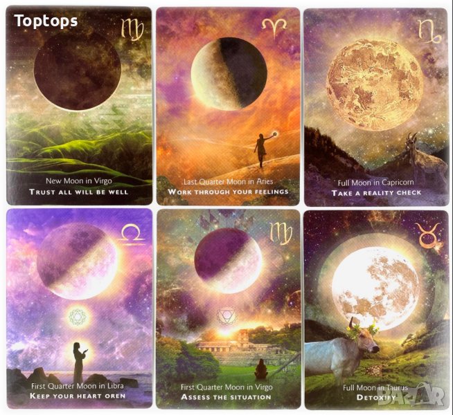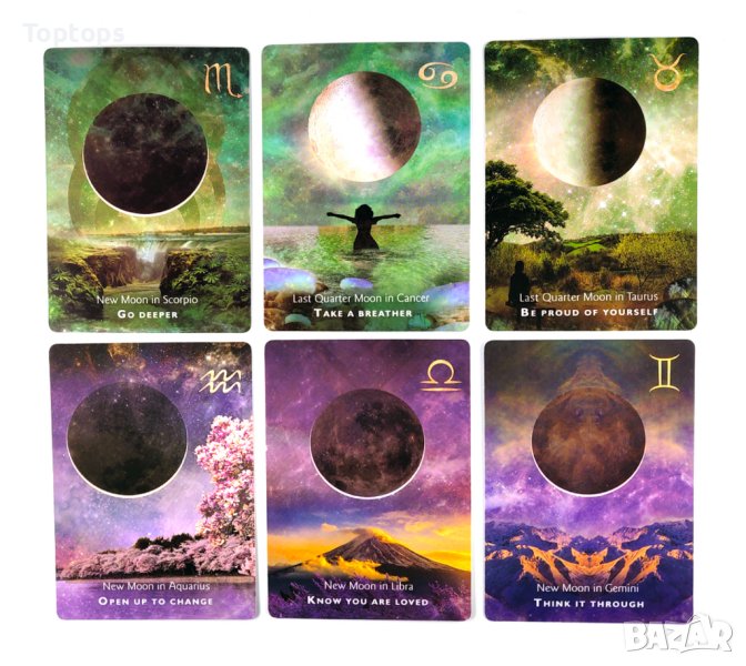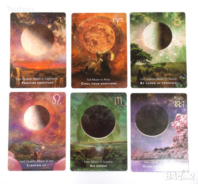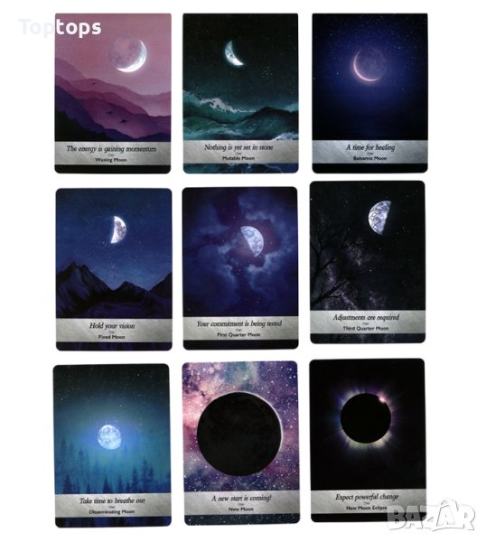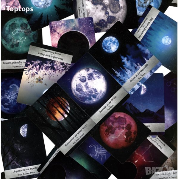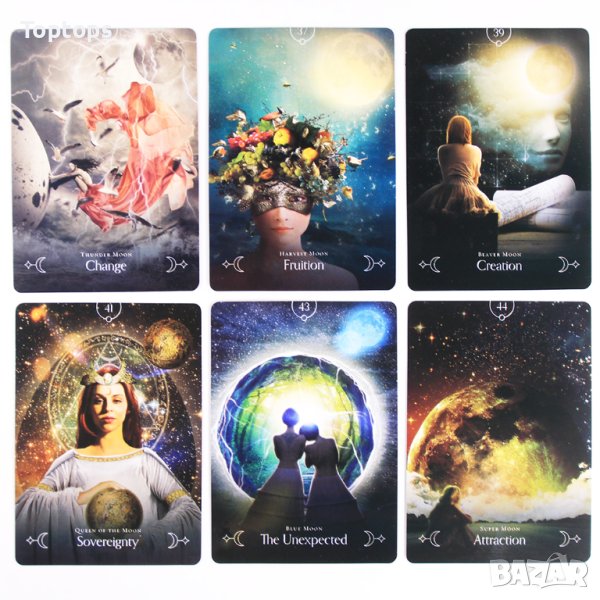 - 44 оракул карти - Moonology Oracle заедно с pdf файл с инструкции на английски, размерът им е 10,3см х 7,5см. Автор е Yasmin Boland.