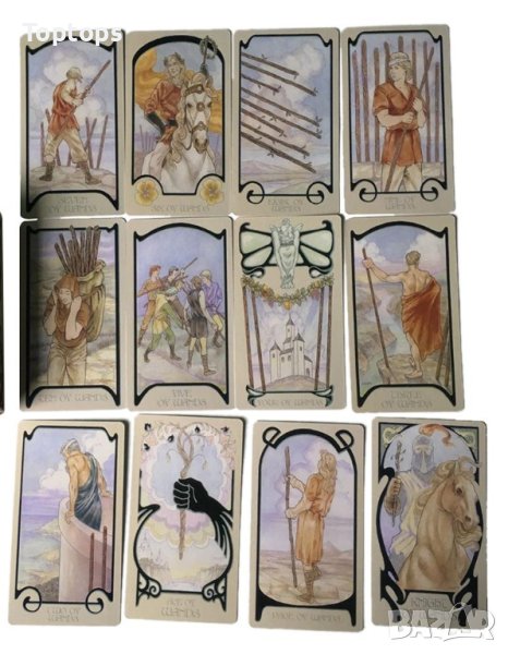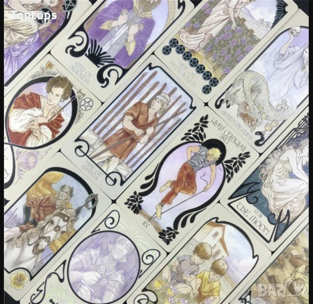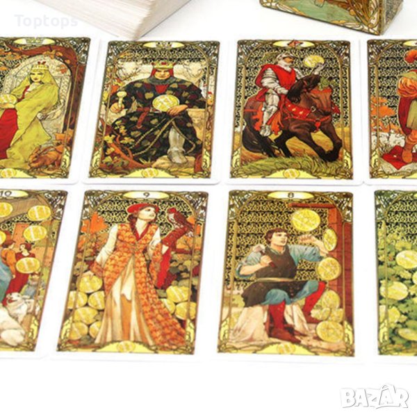 - 78 таро карти - Golden Art Nouveau Tarot заедно с пдф файл с инструкции на английски език, италиански, испански, френски и португалски. Размерът им е 10,5см х 6,3см, колодата е от LoScarabeo.