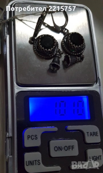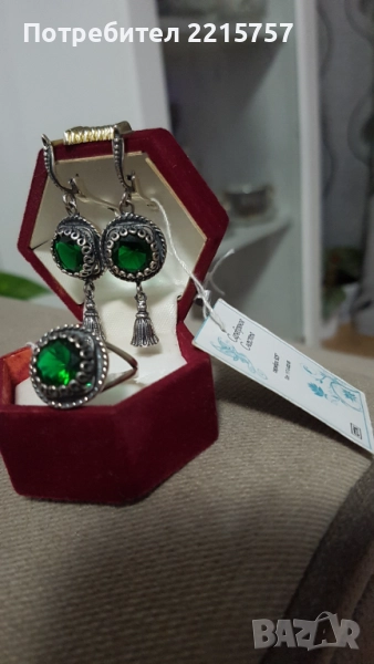 1)К-т сребърни обеци и пръстен с зелен Циркон. Модел винтидж. Нови с етикет и пломба. Обеци дъл.5смн. Пръстен размер 18,5мм. Цена за к-т 245лв.................................................................................................................2)Обеци сребърни с Циркони. СДва вида обеци, нови с етикет и пломба. Дъл.3см. Цена за чифт 85лв...................................................................................................................3)Обеци сребърни с черен Циркон. Нови с. Дъл.3,5см. Цена 75лв...................................................................................................................4)Сребърни обеци с топчета. Дълги 5,5см. Цена 45лв...................................................................................................................5)Сребърно топчета. Диаметър 0,8см. Цена 28лв.