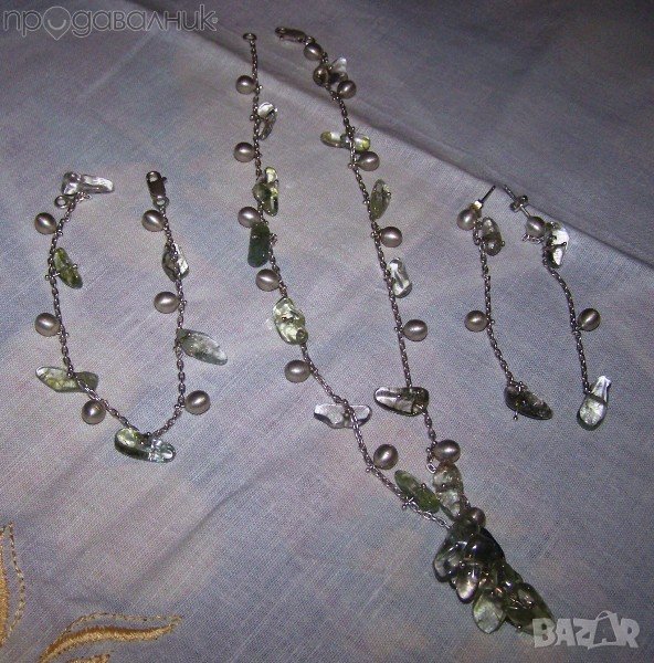 Сребърен комплект с натурални камъни, колие, обеци и гривна. Комплекта е нов, никога не е носен.Камъните са бледо зелени, между тях има сребъни топчета.