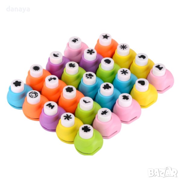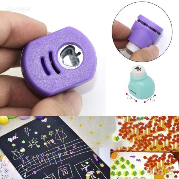Перфоратор пънч с форма на цветя, сърце, ангел, кръг, нота, ябълка, слънце, усмихнато лице, детелинка, пеперуда, чадър, мече, кола, снежинка, звезда, лале, листо, момиче. Уред за изрязване и декориране с хария и картон. Много подходящ за изработване на украса върху картички, проекти и други. Перфораторът е с размер 3×2.5x3cm