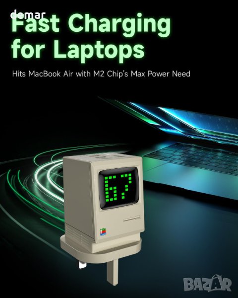 Зарядното устройство Retro 67 USB C съчетава ретро с модерно, включващо екран на дисплея за захранване и Matrix Digital Rain за показване на състоянието на зареждане и мощност в реално време. Зарядното устройство осигурява непрекъснато зареждане със своите уникално проектирани вериги в USB C1, C2 и C3 портове, позволяващи едновременно зареждане без прекъсване, когато е включено ново устройство. С 67 W високоскоростно зареждане, захранвано от технологията All-GaN, той е съвместим с най-новите устройства, като зарежда MacBook Air (M2) за по-малко от 2 часа и iPhone 14 до 58% за 30 минути. Патентованата технология за управление на светлината регулира яркостта на динамичния матричен екран, което го прави удобен за сън. Оборудван със система за активна защита и множество функции за защита, зарядното устройство Retro 67 GaN непрекъснато следи температурата на продукта за безопасно зареждане.