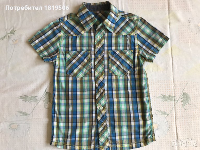 -детска лятна ризка за момче. От материя -памук, без никакви забележи, като нова е. Ризата е много елегантна със свеж десен и цветовете предполагат да се съчетае с различен цвят панталонки. Размери: дължина от врата до долу-54см; ширина на раменете-35; гръдна обиколка-80