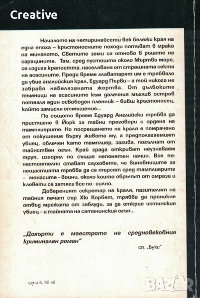 Началото на четиринайсети век бележи края на една епоха — кръстоносните походи потъват в мрака на миналото. Светите земи са отново в ръцете на сарацините. Там, сред пустошта около Мъртво море, се издига крепостта, населявана от страшната секта на асасините. Преди време главатарят им е трябвало да убие английския крал, Едуард Първи — а той никога не забравя набелязаната жертва. От дълбоките тъмници на асасините към далечния мъглив остров потегля един освободен пленник — бивш кръстоносец, който замисля отмъщение…