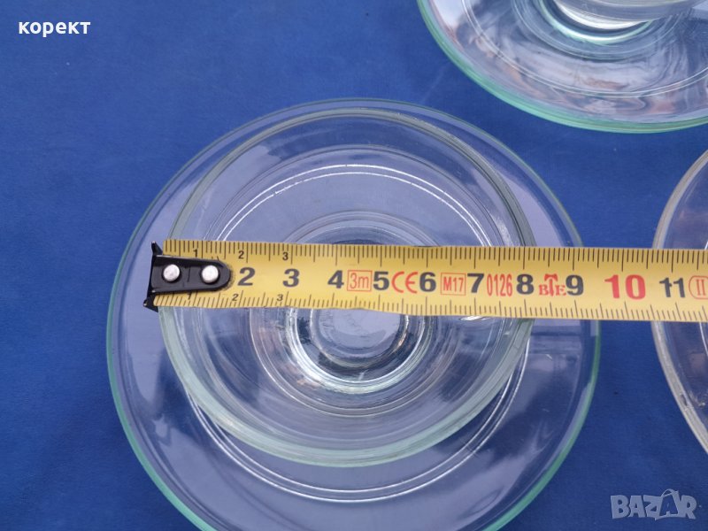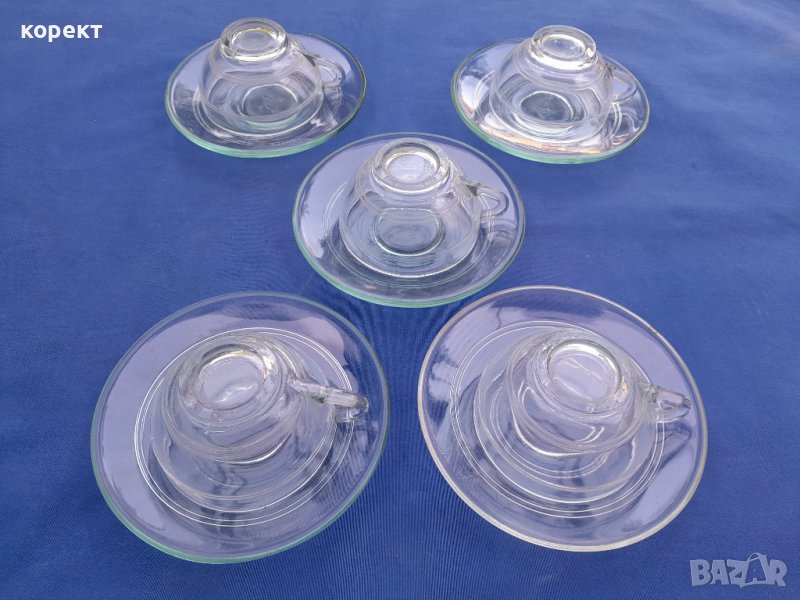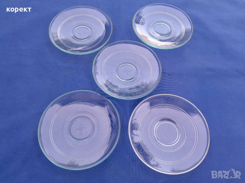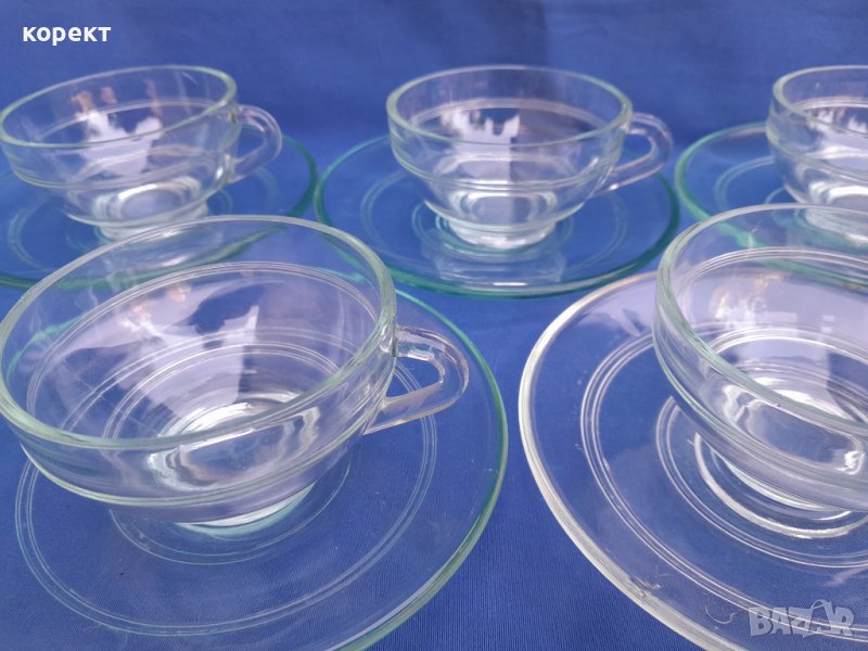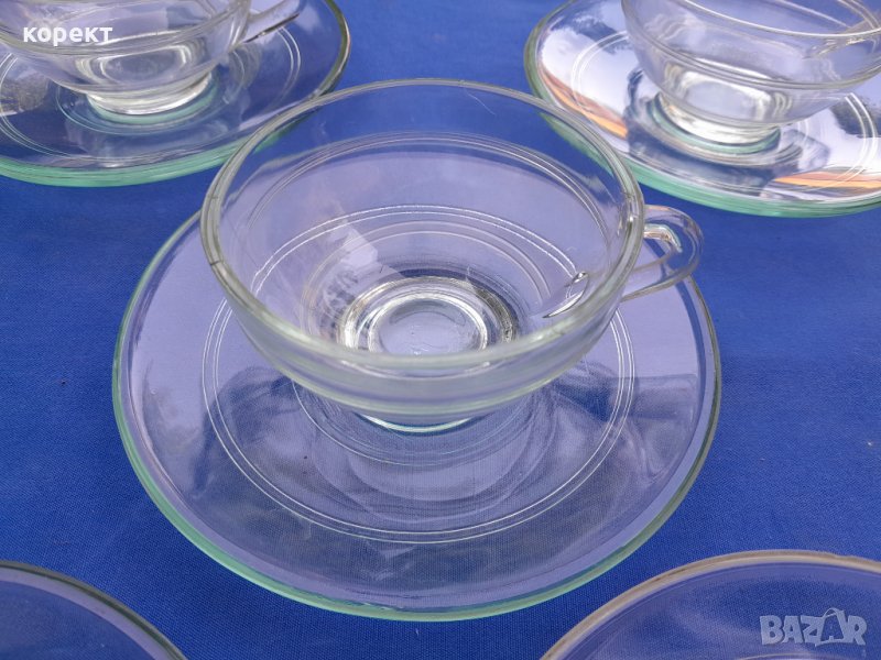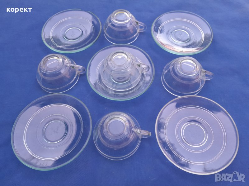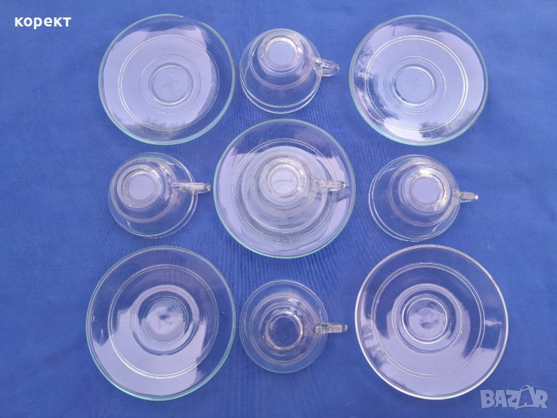 Огнеупорно дебело стъкло. Една ожъбена чинийка която се вижда на снимките. Сервиза е с маркировка. Дълбочина на чашата 4 сантиметра, другите размери се виждат на снимките. За употреба или колекция. Попълвам 10 % намаление на транспорта