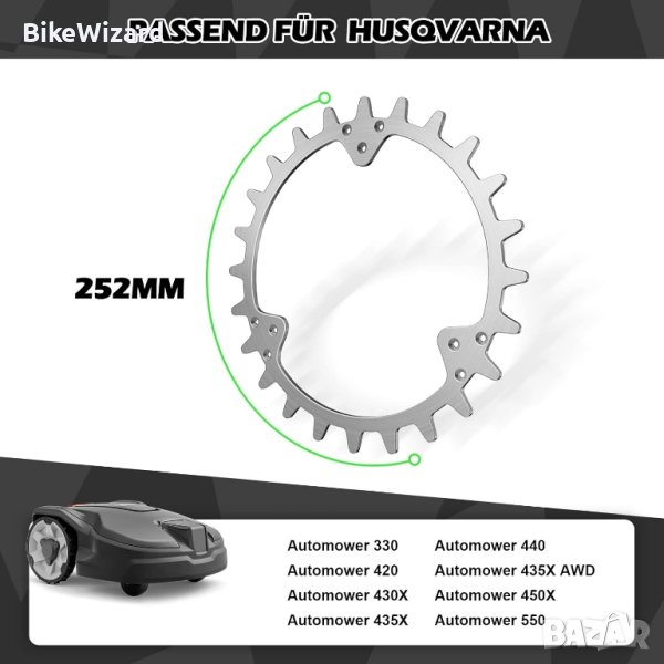 косачката-робот по-добро сцепление, без повече копаене в моравата.изработени от 100% неръждаема стомана. Предимство, свързано с материала, е, че шиповете са устойчиви на ръжда и следователно издръжливи. Размерите са 255 мм х 2 мм. В допълнение са включени 21 винта от неръждаема стомана.Висока съвместимост: с размер на колелото от 255 mm, съвместим с Husqvarna Automower 420 / 320 / 430X /440, изработен от 2,5 mm неръждаема стомана, изящно премахнат, съдържание на кутията: 2 x шипове, 21 x винтове с плоска глава от неръждаема стомана.