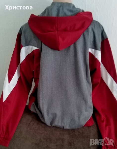 Спортно горнище в тъмно червено (на снимките цветът е по-светъл от действителния),сиво, бяло и оранжево; с цип отпред и ластик в долния край и на ръкавите, с два джоба с цип, с прикачена (с тик-так копчета) качулка.