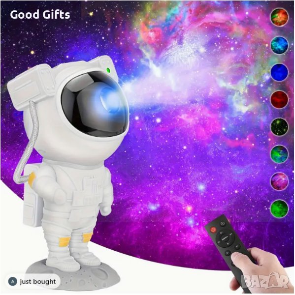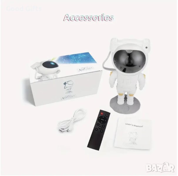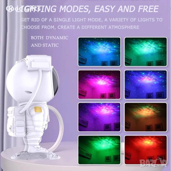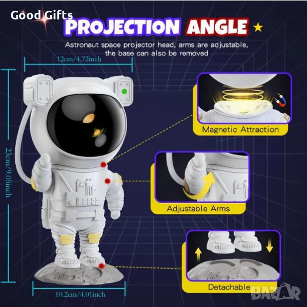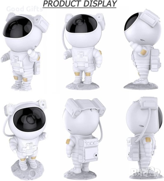 Този звезден проектор за нощна светлина е проектиран да изглежда като астронавт. Дизайнът на външния вид е новаторски и уникален, отразяващ темата за звездното небе и галактиката, а главата на астронавта е магнитно свързана с тялото, което може да бъде завъртяна на 360° позволява мъглявината да бъде проектирана навсякъде без ограничения.