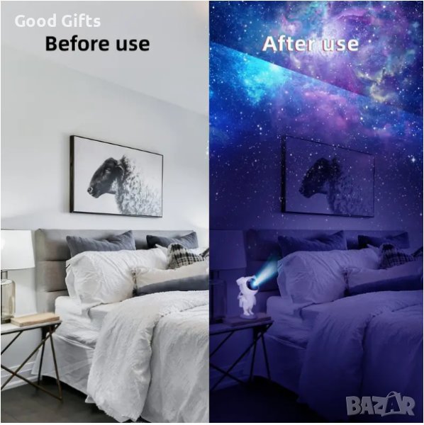 Прожекционната лампа за звездно небе на астронавта с дистанционно управление може да контролира включването/изключването на режимите на мъглявина и звездна светлина. Можете да регулирате яркостта, да промените режима на светлина и може да показва различни ефекти на мъглявина. Можете също така да регулирате скоростта и яркостта на мъглявината. Два режима на време: около 40 минути и около 90 минути, автоматично изключване, можете лесно да получите достъп до тези настройки, без да ставате.