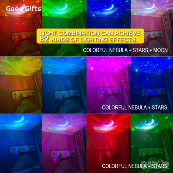 Тази цветна и непредсказуема мъглявина с нощна светлина със звезден проектор се предлага в различни цветови комбинации и е украсена с мигащи звездни светлини. Проектирайте звездната галактика, която се проектира върху вашата стая и таван, карайки ви да се чувствате сякаш сте в огромната галактика, създавайки романтична атмосфера и наслаждавайки се на свободното си време.