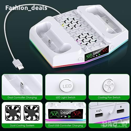 Разполага с вентилатор за охлаждане на конзолата, безжично зарядно устройство за два контролера, 15 RGB светлинни ефекта, кука за слушалки и допълнителен USB порт