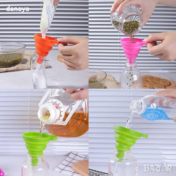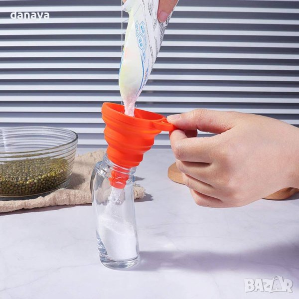Малка сгъваема фуния от силикон за преливане на течности и други хранителни продукти. Когато фунията е сгъната, не заема почти никакво място, което я прави много практичен кухненски помощник и не само. Вземете я със себе си, когато сте на къмпинг, планина, летуване, пикник.