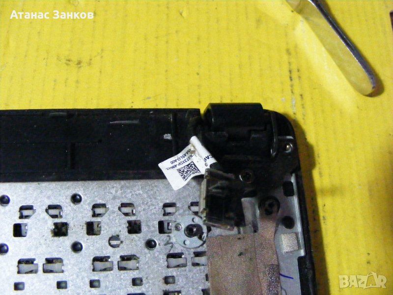 Лаптопа дойде с изкъртена букса за захранването и потрошени пластмаси.