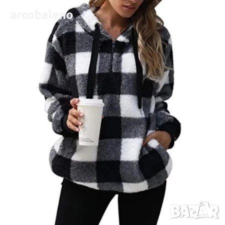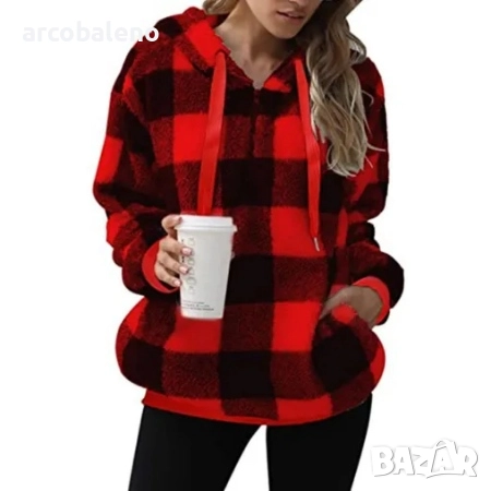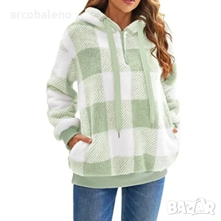 Дамски суичър с дълги ръкави и качулка на каре, 7цвята