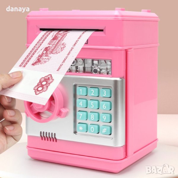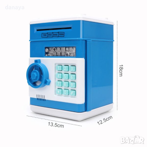 Детска касичка сейф с код, светлини и звуци. Детският сейф с шифър е много атрактивна алтернатива на традиционната касичка. Можете да поставите както банкноти, така и монети в него и да ги премахнете, ако е необходимо, след като въведете съответния код. Сейфът е много добра идея да научите как да спестявате собствените си пари и да планирате разходите си. Банкоматът е подсигурен със специален четирицифрен код. За да можете да се възползвате от спестяванията, натрупани в сейфа, трябва да въведете правилния ПИН. Можете сами да зададете номера. За да направи касичката още по-привлекателна за дете, тя е обогатена с интересни светлинни и звукови ефекти. Характерните бипкащи звуци могат да се променят на глас на английски.