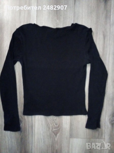 Черна дамска блуза а дълъг ръкав, размер S. Съдържа 95 % памук и 5 % еластан. Ширина в раменете - 38 см, ширина под мишниците - 40 см, дължина от рамото до долу - 50 см, дължина на ръкава от рамото - 57 см. Много запазена, почти не е използвана, без забележки.