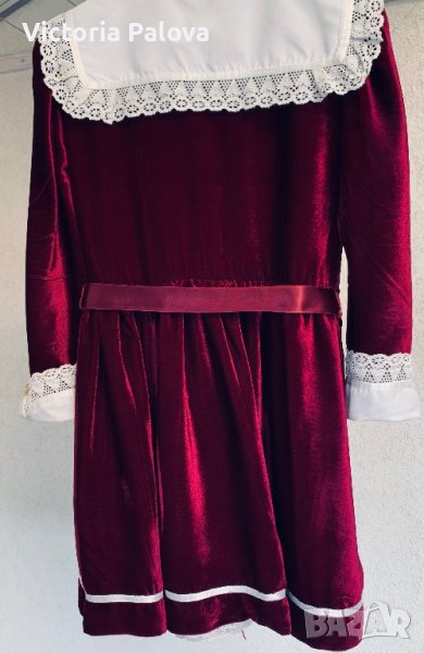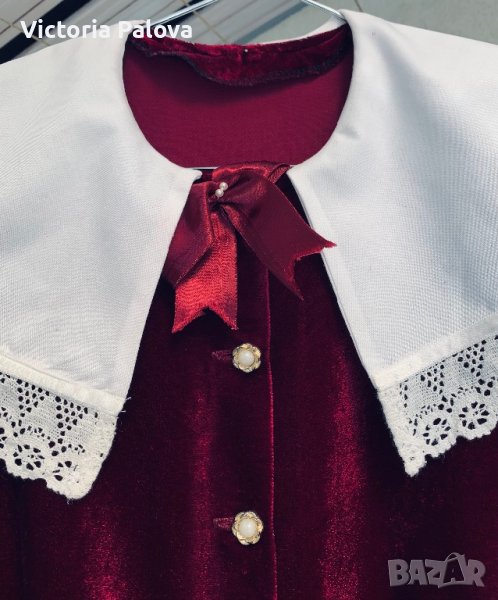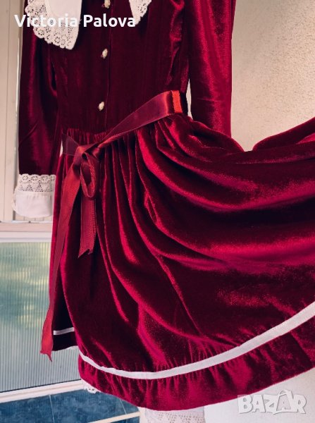 Много красива празнична рокля вишнев цвят ( бордо), буфан ръкав, подплънки, красиви маншети и яка кроше,колан и панделка,подплата.Рамо - 36см, ГО - 42см, дължина - 79см, ръкав - 48см.