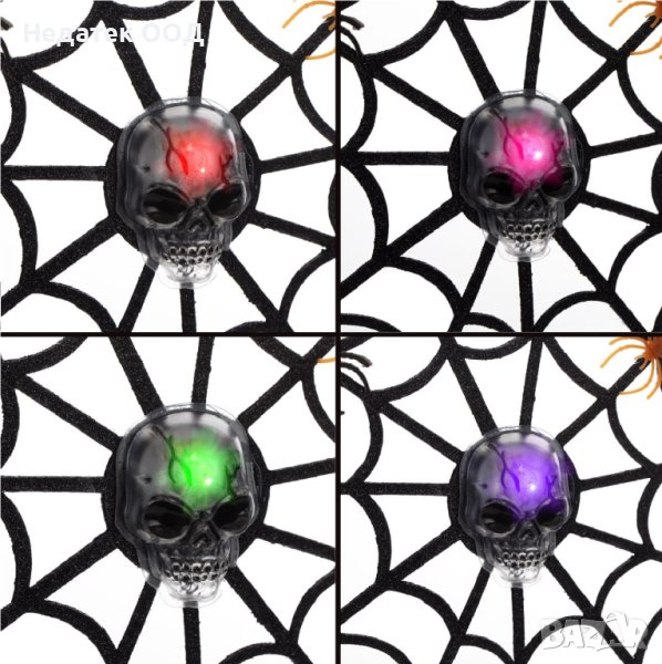Декорация за Хелоуин, паяжина черна с блясък и череп със светлина, която променя цветовете. Работи с батерии (включени и не подлежат на смяна).