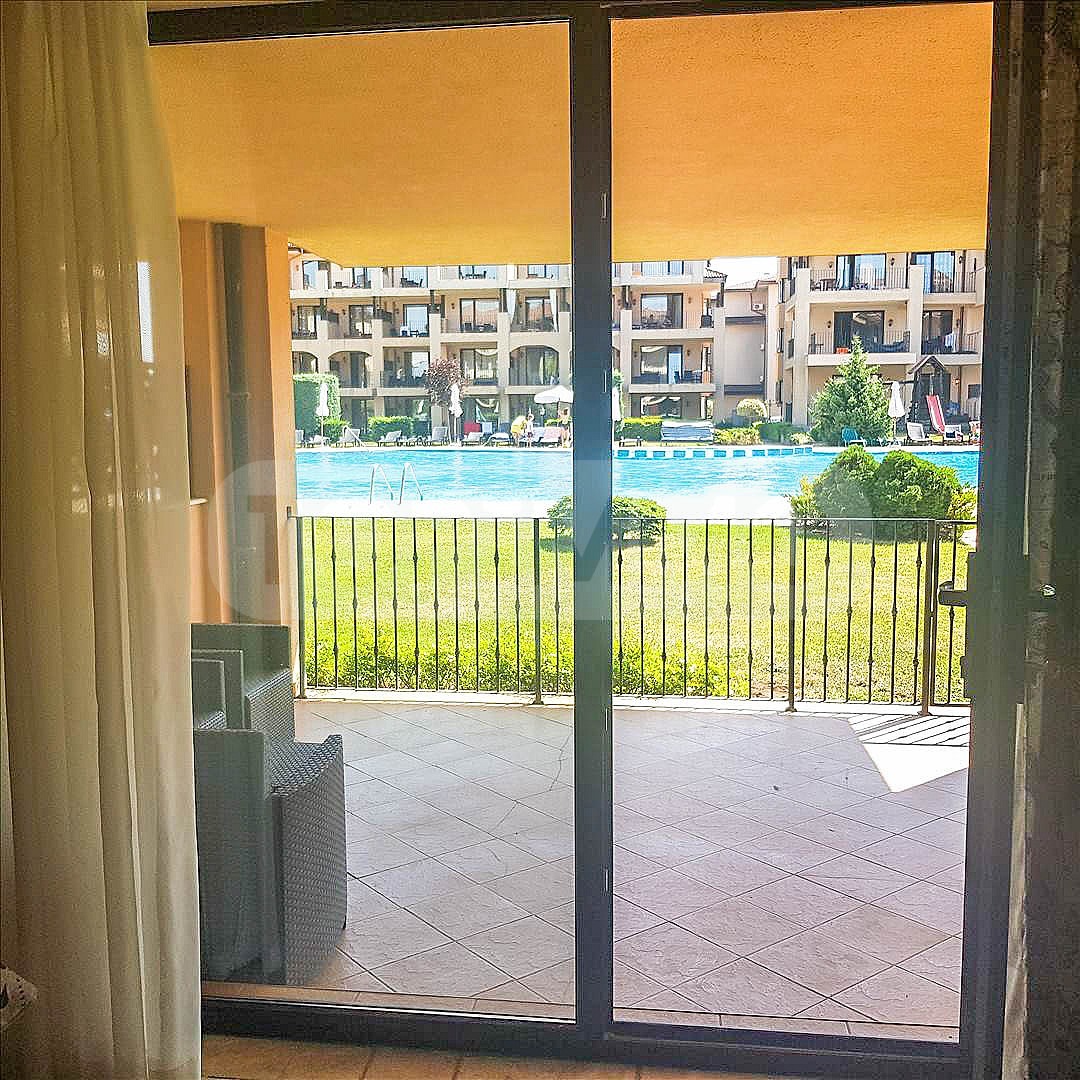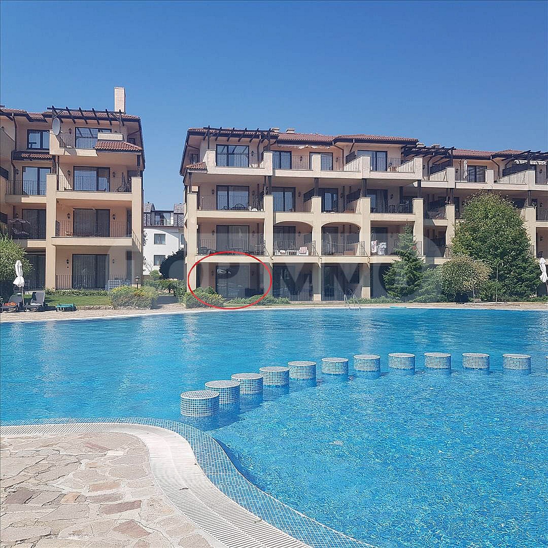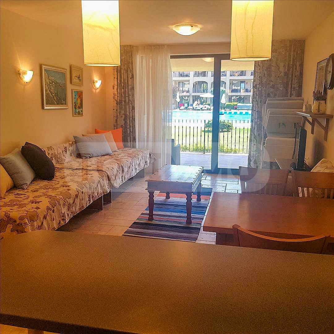 Апартаментът е просторен, напълно обзаведен и климатизиран. Състои се от коридор, всекидневна с кухненски бокс, една спалня, перално помещение, баня с тоалетна и голяма тераса с директен достъп до градината и един от петте басейна в комплекса.