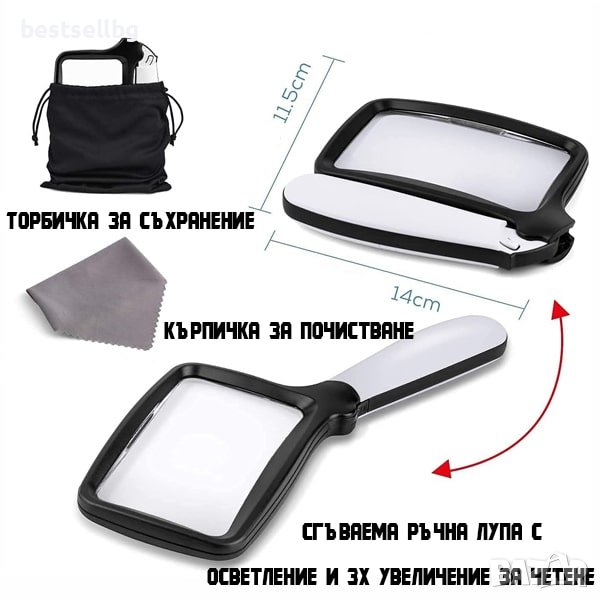 С тази сгъваема лупа с 3-кратно увеличение и LED осветление, ще разкриете света на дребните детайли с удоволствие и леснота. Не изпускайте възможността да добавите този удобен инструмент към вашата колекция от ежедневни аксесоари.