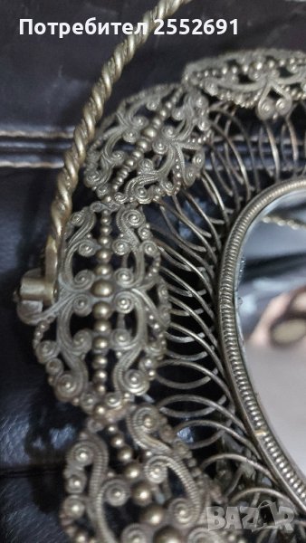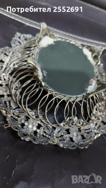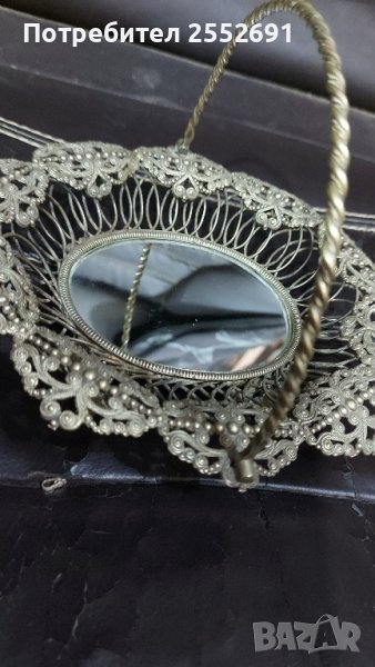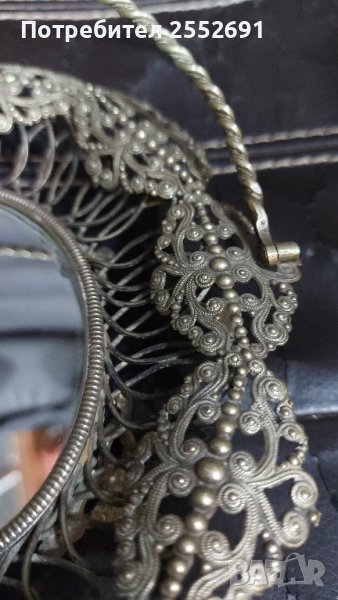 Старинен,ажурен, ръчно изработен, инкрустиран съд с дръжка. Дължина- 19см. Ширина- 17см. Височина- 4см; 12см с дръжка