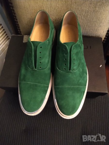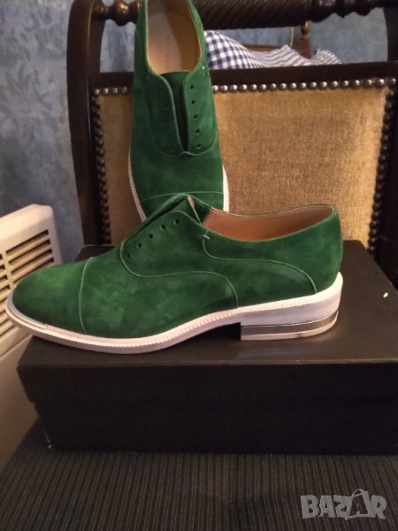 Красив зелен цвят естествен велур ,с сребърни орнаменти отпред и на тока .