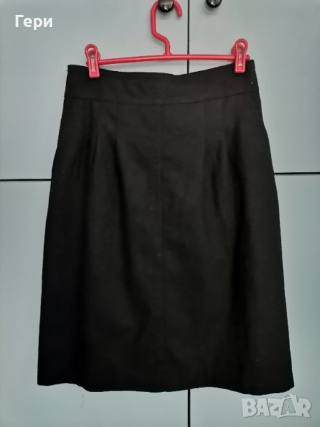 Материята е топла, идеална за студените дни, съдържа вълна в състава. С подплата и джобове. Размер 36 по етикет. Талия - 36 см, дължина - 62 см, ханш - 50 см.