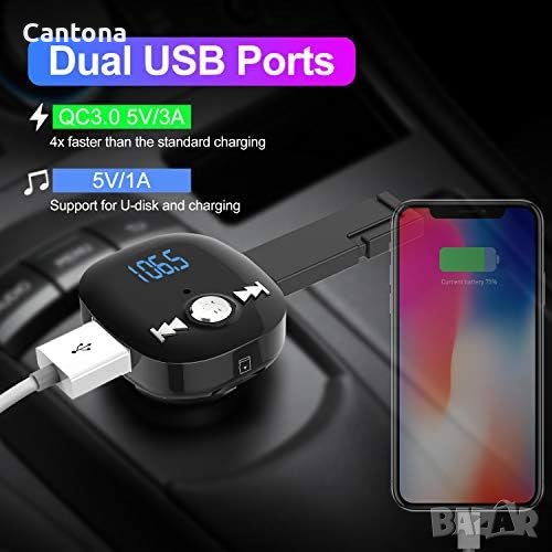 - Bluetooth FM предавателят Clydek поддържа зареждане на двете устройства едновременно. Портът QC3.0 може да зарежда телефона до 80% за 35 минути, а друг USB порт за зареждане (5V/1A) също функционира като U диск порт до 32GB. Споделете порта за зареждане с приятелите си, докато слушате музика.